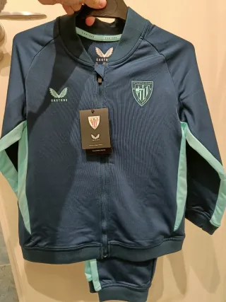 Conjunto de chándal original del Athletic Club. Talla 128 cm. Para unos 6 años. Aunque en etiqueta pone 7-8 años de mangas va corto y lo aconsejo para 6 años. - Chaqueta con cremallera completa. - Pantalón a juego. - Diseño deportivo.
