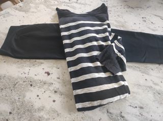 Conjunto de ropa premamá con un diseño de rayas. - Camiseta de manga larga con rayas horizontales, Zara talla M - Pantalón o legging negro canalé, H&M, talla S - En buen estado -Sólo hago envíos