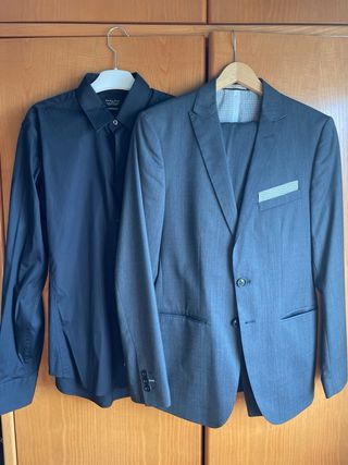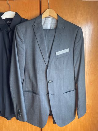Conjunto de traje gris de Zara Man con camisa negra. - Chaqueta de traje con solapa de muesca. talla M/L - Bolsillo de pecho con pañuelo. - Cierre de dos botones. - Puño con tres botones. - Camisa negra de manga larga. talla L - Pantalón a juego con la chaqueta. Talla M/L