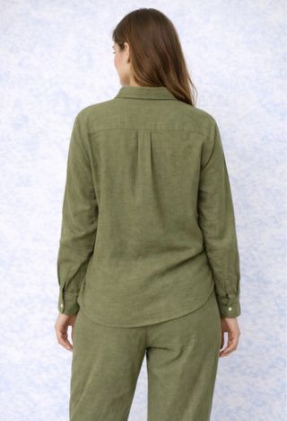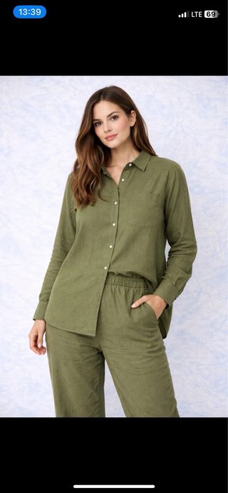 ✅Conjunto de pijama en color verde oliva. La tela tiene una textura ligera y agradable.✨ - Camisa de manga larga.✅ - Pantalón de corte ancho.✅