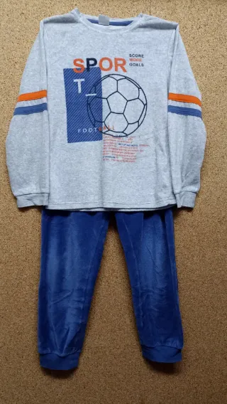 Conjunto de pijama para niño con estampado de fútbol. - Camiseta de manga larga gris con detalles naranjas y azules en las mangas. - Pantalón largo azul. - Diseño con balón de fútbol y texto 'SPORT', 'FOOTBALL', 'SCORE MORE GOALS'. Talla 12 años