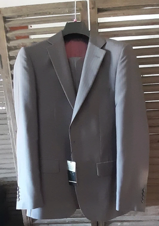 Traje de chaqueta elegante gris con raya completamente nuevo y con su etiqueta original. Vendo por un precio simbólico. Ideal para ocasiones especiales, bodas, comuniones, bautizos, feria, Semana Santa, navidad. Fin de Año… MEDIDAS CHAQUETA Hombro: 43 cm Largo Chaqueta: 81 cm Largo Manga: 64 cm De axila a Axila: 50 cm MEDIDAS PANTALÓN Cintura: 40 cm Cadera: 50 cm Muslo: 28 cm Pernil: 28 cm Largo interior pierna: 83 cm Largo Pantalón desde la cintura: 108 cm - Pantalón a juego.