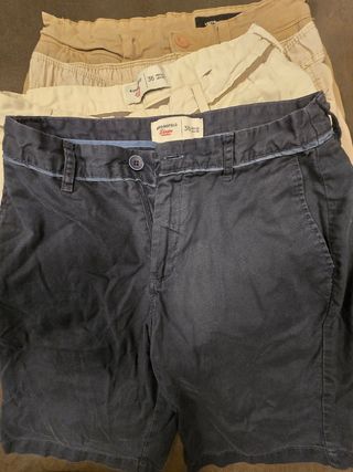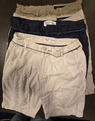 Conjunto de pantalones cortos para chico, talla 36 como podéis ver en imágenes. 2 pantalones Sprinfield 36 y 2 de lefties talla S - 2 Pantalones cortos de color beige - 1 Pantalón corto de color azul marino. Y otro crema - Varias camisetas manga larga de regalo