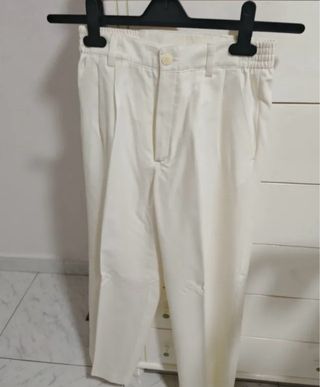 Conjunto de traje de marinero para niño, ideal para comuniones. Incluye chaqueta y pantalón. Casaca azul y pantalón blanco. • Diseño clásico de marinero. • Detalles de cuello y puños en blanco. • Lazada decorativa en la parte delantera. No tiene enganchones ni defectos, solo usado una vez. Es talla 10. Medidas: Ancho de espalda: 38 cm Largo de la casaca: 80 cm Largo de manga: 50 cm Pantalón: Cintura: 69 cm (lleva goma, puede dar más talla) Largo total: 87cm. Lleva bajo para sacar.