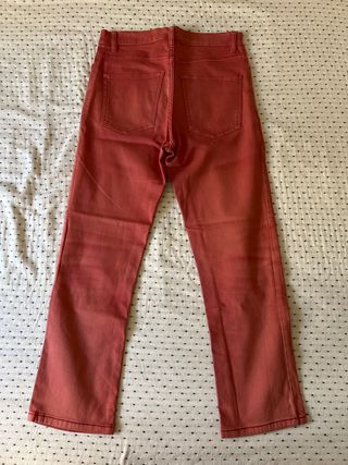 Pantalón vaquero de color rojo para mujer. - Corte recto. - Cintura alta. - Cierre de cremallera y botón.