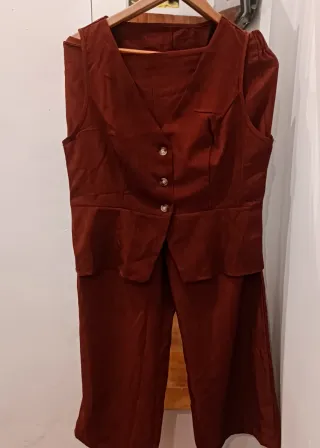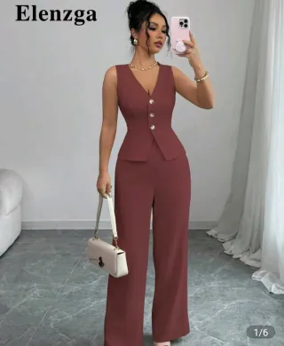 Elegante conjunto de pantalón y chaleco. - Chaleco sin mangas con cuello en V. - Cierre de botones en el chaleco. - Pantalón de pierna ancha.