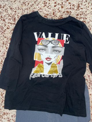 Camiseta negra de manga larga con un llamativo estampado frontal. - Diseño de chica con gafas y labios rojos. - Detalle de texto Real Cool Girls. - Parte superior de la camiseta con la palabra VALUE en blanco. Junto a pantalón muy cómodo, gris, también de talla S