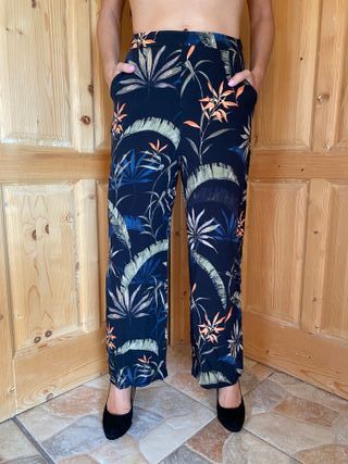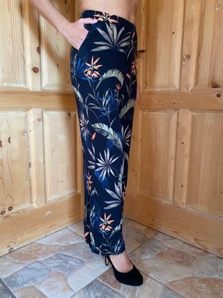 Pantalones largos con un llamativo estampado tropical. Talla 36 de Mango. - Diseño de hojas y flores. - Cintura elástica. - Corte recto.