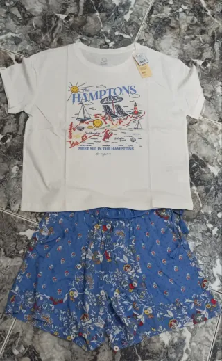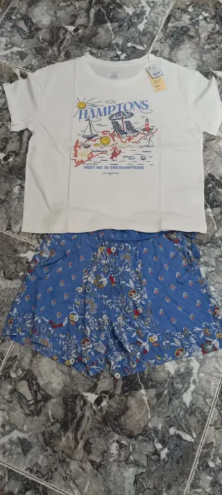 Vendo pijama nuevo, de dos piezas con una estética muy playera y cómoda. Tejido suave y fresco, perfecto para dormir o estar por casa. Camiseta blanca color de manga corta y corte ligeramente cropped. Presenta un diseño gráfico colorido de "The Hamptons" en colaboración con Smiley World. Talla M Pantalón corto, tipo "flowy" en color azul con estampado floral y detalles boho. Tiene cintura elástica y cordón ajustable con pompones/borlas a los lados. #pijama #smileyworld #hamptons #verano #summer #boho #newwithtags #ropadedormir #womensecret