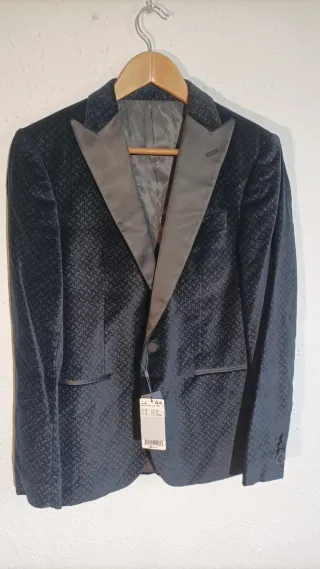 Elegante blazer de Mango con un sutil estampado. - Material: Terciopelo. - Color: Negro y gris. - Tallas: Americana 48. Pantalón 42.
