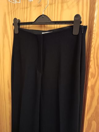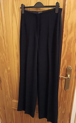 Pantalón largo, pierna ancha, tejido con caída, cremallera lateral. Entallado en cintura y culo, y piernas anchas. Nuevo sin etiqueta de cartonaje porque lo compré así. Largura:111cm; ancho de pierna 22cm.
