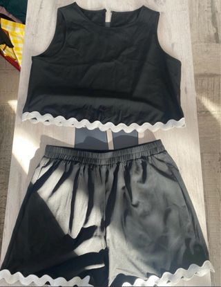 Conjunto de dos piezas de Shein, ideal para un look casual y cómodo. - Top sin mangas con detalle de volante festoneado en el bajo. - Shorts con cintura elástica y volante festoneado en el bajo. -Buen estado