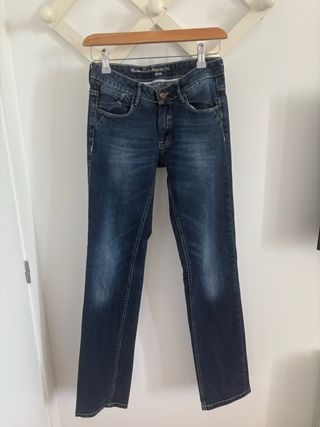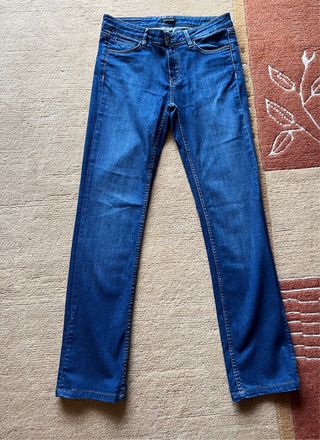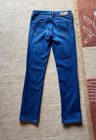 Pantalón tejano / vaquero de corte recto para mujer, marca Massimo Dutti, prácticamente nuevo, solo 2 puestas. Es bastante fino, el color es como sale en las fotos (azul „medio“) - Tejido denim. - Cintura alta. - Cierre con cremallera y botón.