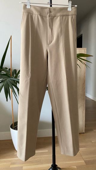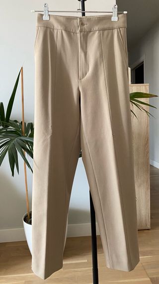 Pantalón de corte recto en tono beige claro, ideal para looks formales o business casual. Talla 34, usados en contadas ocasiones. Con pinzas marcadas al frente que estilizan la figura y un cierre de botón en la cintura. Tejido suave y estructurado, perfecto para primavera y otoño.