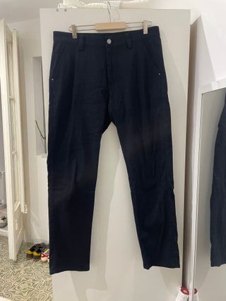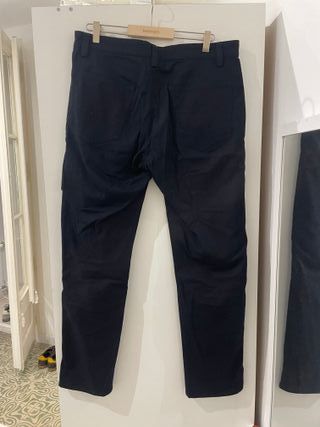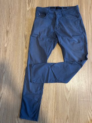 Pantalón de corte recto en tono azul marino, ideal para looks formales o business casual. Talla 34, usados en contadas ocasiones. Con pinzas marcadas al frente que estilizan la figura y un cierre de botón en la cintura. Tejido suave y estructurado, perfecto para primavera y otoño.