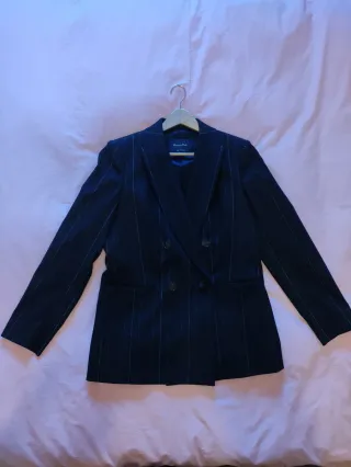 Elegante traje de Massimo Dutti con un diseño de rayas finas doradas. - Diseño cruzado con doble abotonadura. - Cuello solapa. - Bolsillos frontales con solapa. Precio negociable.