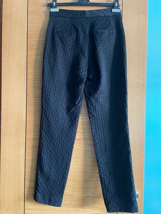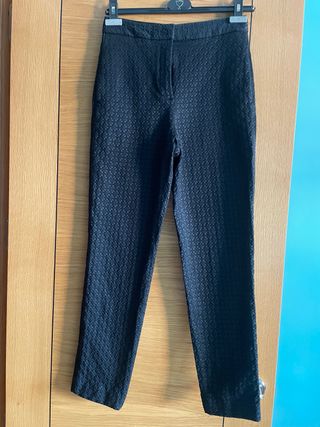 Pantalón de vestir de corte recto y tiro alto. - Tejido con textura discreta. - Bolsillos laterales. - Cierre de cremallera y botón. - Tejido un poco elástico. Indica talla 38 pero dan poca talla, una 36 se ajusta más. Están en muy buen estado. La modelo mide 1,65. Falta botón interior. Tejido: 50% algodón 45% poliamida 5% elastano