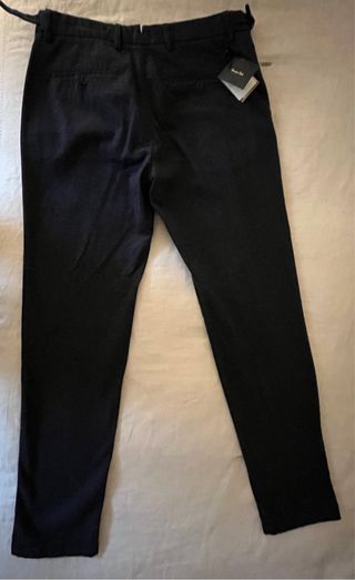 Pantalón de vestir de corte elegante. - Diseño de talle alto. - Costuras centrales. - Bolsillos laterales. - Cierre de cremallera y botón. - Tejido un poco elástico. Indica talla 38 pero dan poca talla, una 36 se ajusta más. Están en muy buen estado. La modelo mide 1,65. Falta botón interior. Tejido: 40%algodón 45% poliamida 15% elastano