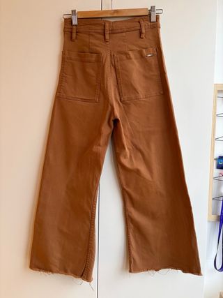 Pantalón tobillero de talle alto en tejido denim de Massimo Dutti en talla XS de color marrón camel. El pantalón queda a la altura de los tobillos (yo mido 1.58 cm). Usado, pero como nuevo.