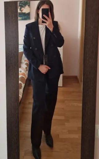 Traje de Massimo Dutti en talla 38. Muy pocas puestas. El pantalón tiene doblez en el bajo y es tobillero. La chaqueta entallada en color negro con raya diplomática.