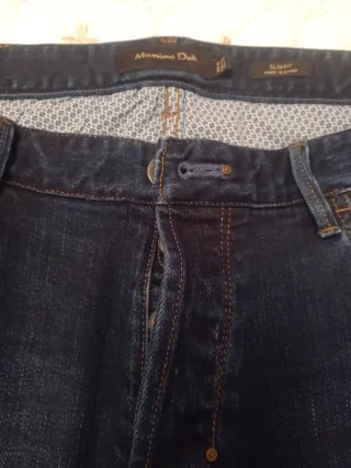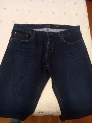 Se venden pantalones de la marca Massimo Dutti de corte ajustado (slim fit) en color azul claro. Una prenda moderna, cómoda y muy versátil, perfecta tanto para looks casuales como para combinaciones más arregladas. Diseño clásico de 5 bolsillos con cierre con botón metálico y cremallera. Se adjunta foto de la etiqueta interior de Massimo Dutti. En muy buen estado, usados en contadas ocasiones, sin desgastes ni manchas.