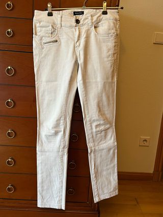 Pantalones vaqueros pitillo de tiro bajo, color blanco roto. Son de talla M (equivalente a 38 o 10). Se encuentran en buen estado, con un ligero desgaste en la zona de los bolsillos traseros. - Corte pitillo - Tiro bajo - Color blanco