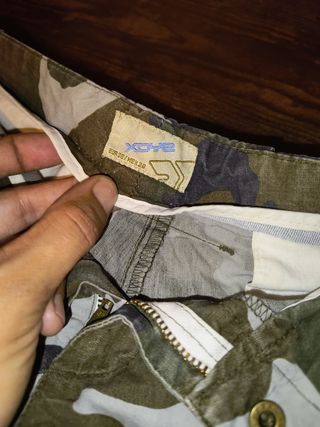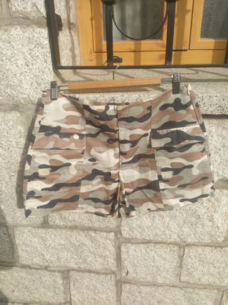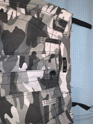Shorts de estilo militar con estampado de camuflaje. - Cintura con trabillas para cinturón. - Cierre de cremallera y boton click. - Bolsillos delanteros y traseros reales, con solapa y botón. Es talla 38 pero seria una 36 de las de hoy en día
