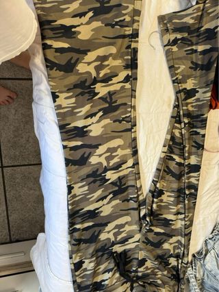 Pantalones militares de camuflaje en tonos verdes y verde oliva. Son de estilo cargo y parecen estar en buen estado. - Diseño cargo con bolsillos laterales. - Cierre con botones. - Tejido resistente.