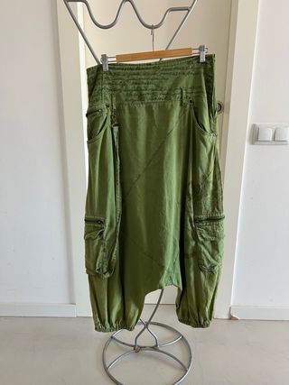 Pantalones harem de color verde militar, ideales para un look cómodo y original. Son holgados y tienen varios bolsillos. - Diseño único con detalles bordados. - Cintura elástica alta. - Tejido ligero y fresco. - Perfectos para cualquier ocasión.