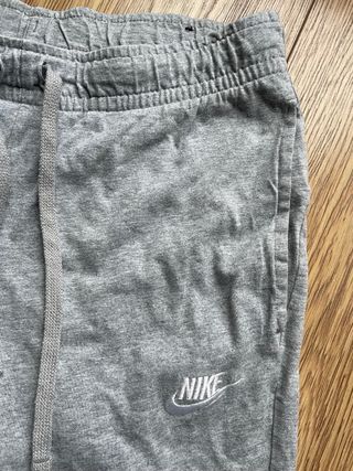 Pantalones deportivos Nike con un diseño moderno y cómodo. - Combinación de colores gris y blanco. - Cintura elástica con cordón. - Paneles de tela. - Logo de Nike visible.