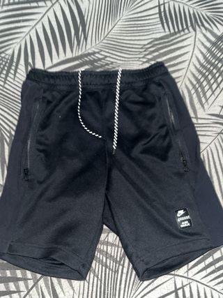 Shorts deportivos Nike Air Max. Son de color negro y tienen un diseño elegante. - Bolsillos con cremallera. - Cintura elástica con cordón. - Están en muy buen estado. -brillan con la luz los cordones