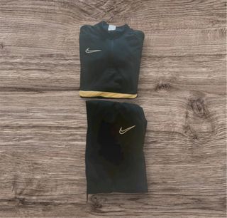 Conjunto deportivo completo de la marca Nike, en colores negro y verde. Ideal para entrenamientos o uso casual. - Chaqueta con capucha y cremallera completa. - Pantalón a juego. - Bolsillos con cremallera en la chaqueta y el pantalón.