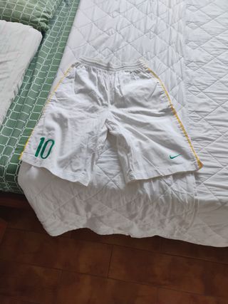 Pantalones cortos de fútbol, en blanco y verde. Son de la selección brasileña y llevan el número 10. Están en buen estado. - Número 10 bordado. - Detalles en verde y amarillo.