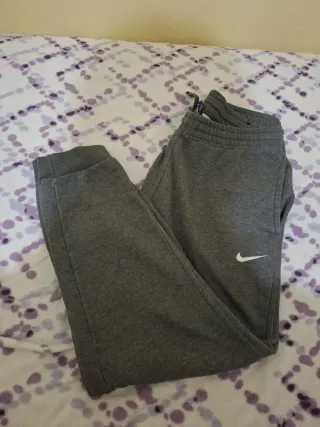 Pantalón de chándal Nike en color gris, talla M. Diseño moderno y cómodo. - Cintura elástica con cordón ajustable. - Bolsillos laterales. - Logo de Nike en la pierna.