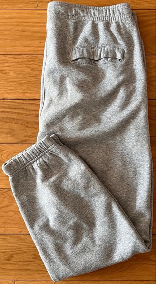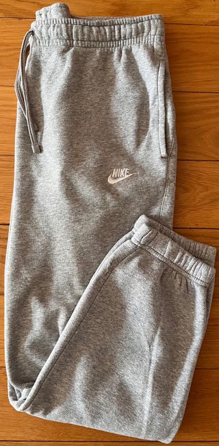 Pantalón de chándal Nike para hombre, de color gris. Presenta un diseño moderno y cómodo. - Cremallera lateral en uno de los bolsillos. - Cordón ajustable en la cintura. - Logo de Nike bordado en la parte frontal. - Todas las cremalleras funcionan - Tiene una pequeña mancha en la parte superior izquierda