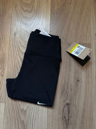 Leggings negros de talle alto, suaves y aterciopelados, densidad media (se estiran y secan rápidamente), sin costura delantera, bolsillo interior trasero y logo en blanco. 80% poliéster, 20% elastano. Talla S, nuevos con etiquetas. Están en la web de nike a 49,99€ actualmente.