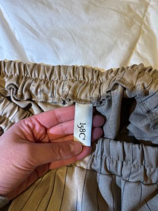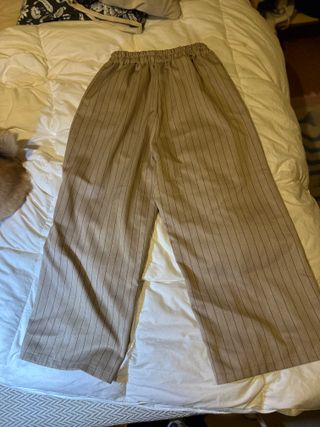 Pantalón largo de corte recto con un diseño de rayas verticales finas. Mido 1,60m y me llegan a los tobillos, tipo recto/palazzo. Los bolsillos no sirven porque los mandé a entallar en la parte de las caderas. - Cintura elástica. - Tejido ligero.