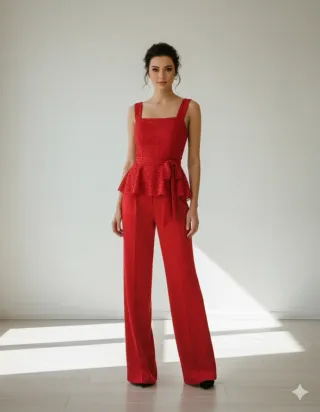 Elegante conjunto de dos piezas en color rojo. - Top con escote cuadrado y peplum. - Pantalón palazzo de talle alto. - Detalle de lazo en la cintura.