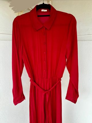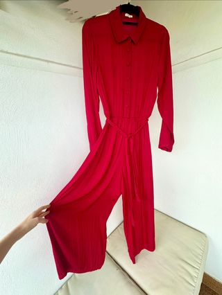 Elegante mono de Oysho en color rojo, con un tacto sedoso y diseño fluido. Pantalon palazzo. - Cintura marcada con cinturón. - Cuello camisero. - Cierre de botones. - Piernas anchas.