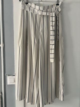 Pantalones palazzo de tela con un diseño de rayas verticales en blanco y negro. Cuentan con un cinturón a juego para anudar a la cintura. - Diseño de rayas verticales. - Cinturón incluido. - Corte palazzo ancho.