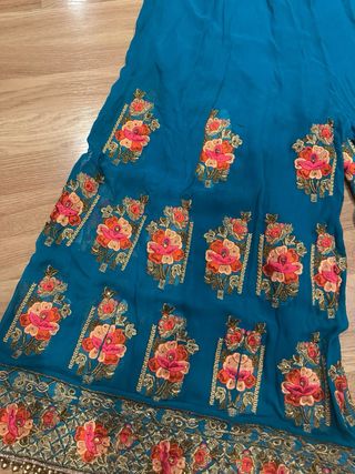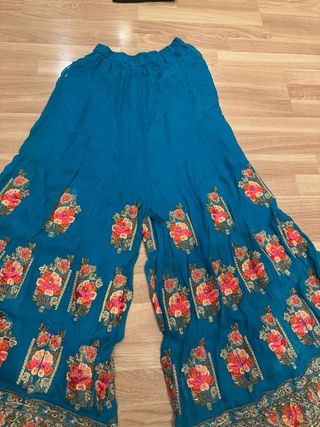 Pantalones estilo palazzo con un diseño inspirado en la moda de la India y Bollywood. Son fluidos y cómodos. - Estampado floral vibrante. - Detalle de bordado dorado. - Cintura elástica para un ajuste cómodo.