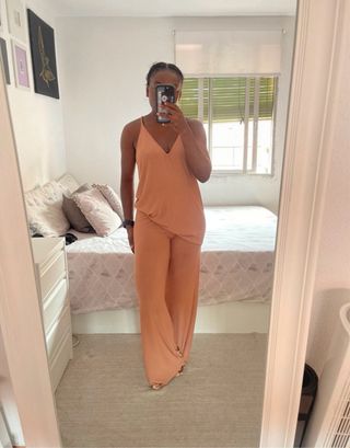 Conjunto de dos piezas de Zara. - Top de tirantes con escote en V. Talla M - Pantalón palazzo de pierna ancha. Talla S