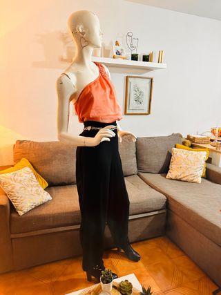Efecto "pierna abierta": El pantalón cuenta con una sobretela lateral que se abre al caminar, aportando mucho movimiento y un estilo sofisticado tipo "palazzo" con abertura. Estado: En perfecto estado Talla:S/M