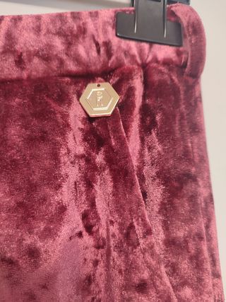 Pantalón tipo terciopelo en tono burdeos. Bolsillos laterales y goma en la cintura. Cinturón del mismo tejido. Usado en una ocasión. Muy cómodo. Talla 42 italiana, correspondiente a una 38