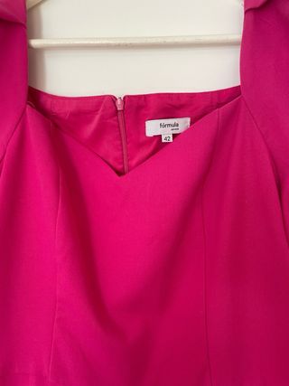 Mono para invitada en color fucsia de fórmula joven en talla 42. Con manga corta abullonada, cremallera trasera y pantalón ancho estilo palazzo. Color muy primaveral y favorecedor. Está arreglado de largo, yo mido 161 y está arreglado para que con cuñas no arrastre. Si necesitas medidas te las puedo dar. Usado en 2 ocasiones, lo único que tiene son las bolitas en la entrepierna del propio tejido, se ve en las fotos.