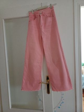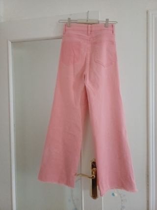 Pantalones vaqueros de color rosa claro. Son de tiro alto y corte ancho, con bajo deshilachado. - Diseño de tiro alto. - Corte ancho, estilo palazzo. - Bajo con acabado deshilachado. - Tejido de algodón.