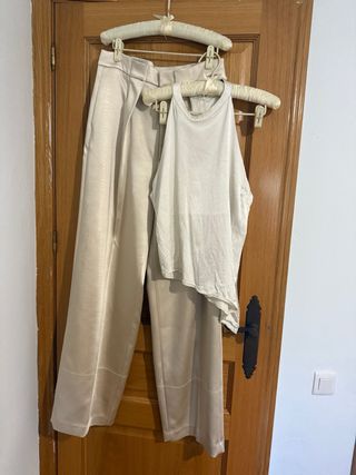 Elegante conjunto de dos piezas en tono champagne, perfecto para ocasiones especiales. - Pantalón palazzo poliester de satén con costuras decorativas. talla M; largo 116 cm, cintura 40 cm - Top lencero halter de tirantes finos, de viscosa. Talla L, ancho 46 cm de sisa a sisa, largo (por su parte más corta) 52 cm