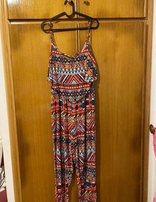 Mono largo con un vibrante estampado geométrico. Ideal para un look casual y llamativo. - Diseño con tirantes finos. - Volante en la zona del pecho. - Pantalón tipo palazzo.