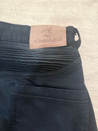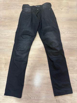 Pantalones vaqueros con un diseño moderno y con protecciones para moto. - Negros con efecto desgastado. - Protecciones integradas en rodillas y caderas. - Marca Bela. - Talla M - Usados muy poco. Solo para prácticas y examen en circuito abierto. - Como nuevos.