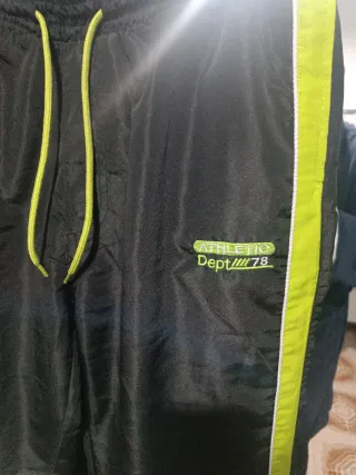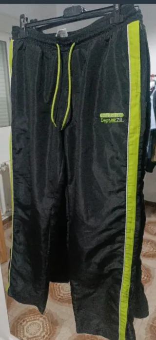 Pantalón de chándal con un diseño moderno y deportivo. -Cremalleras en los bajos. - Cintura con cordón ajustable. - Raya lateral en color verde.
